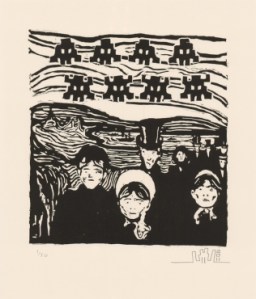 When I bumped into Invader ealier this year at the MOCA, he was wearing a Scream inspired Tshirt. So it’s fun to see him releasing linocut series on the Scream theme.