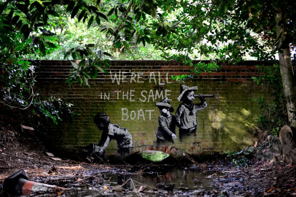 Elusive artist Banksy seems to be enjoying a staycation on the British seaside this summer. Several stencilled artworks have popped up in Suffolk, in Lowestoft, Gorleston, Great Yarmouth and Cromer. With a careful selection of locations, the artworks play with their surroundings: a child is building a sand castle on the pavement, reminiscent of the 1968 French student’s uprising ‘ Sous les paves la plage’ ( beneath the pavement, the beach). Another artwork features three children who seem to empty buckets of water and stare at the horizon while a message reads ‘ We all in the same boat’.