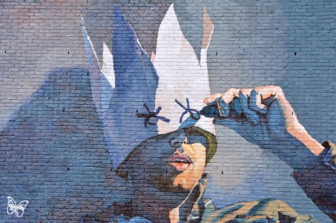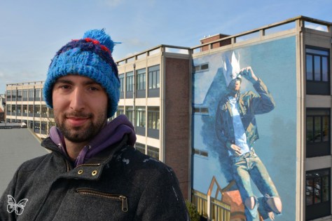 She took our hands and with tears on her eyes she told us:” You know that in this exact place you have your boom lift as you can see, there is a hole between the two buildings. You know why? In 1942, the Germans exploded a bomb right here. I witnessed everything… And now everyday, every time I will look through my window I will see your wonderful and colourful mural. Thank you so much for your present, you cannot imagine what it means to me..” We tried not to cry with her..