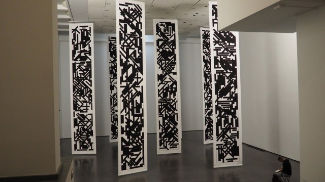 Patron of the Biennale, Tania Mouraud (b.1942) is a French multidisciplinary artist whose practice has been deployed since the late 1960s through paintings, installations, performances and videos. Her distinctive calligraphic style is highlighted by seven kakemonos from the series Mots-Mêlés surrounded by a large mural ‘Only the sound remains’, playing between letters, barcodes and graphic design.