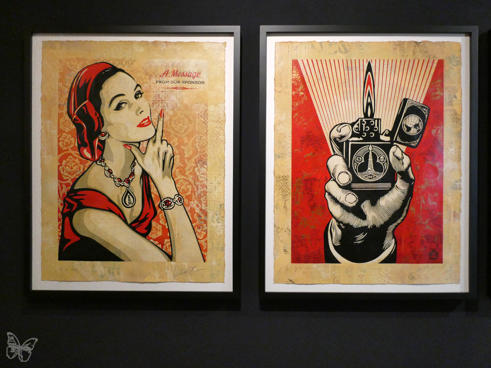 For this exhibition Shepard Fairey decided to use a wide range of mediums (from mixed-media paintings on canvas, stencils, collage, illustrations, and prints) and juxtaposes colours with images, patterns and text, and feature icons like Keith Haring, Greta Thunberg and Edward Snowden to convey clear messages and raise questions as well as voice concerns about various notions of power.