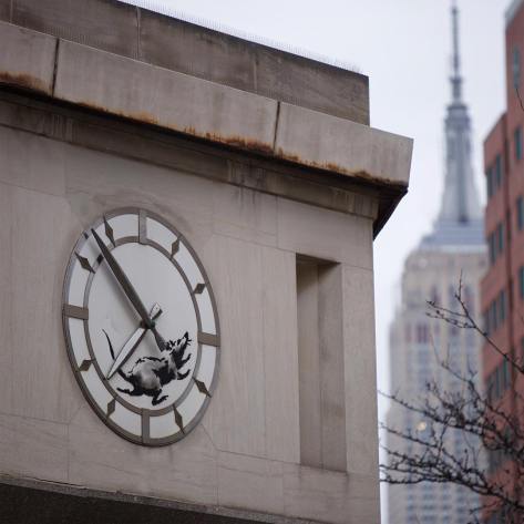 We are always excited to see new works by elusive artist Banksy. He’s back to the streets of New York with a new stencil, featuring a rat running in a clock turned wheel, reminiscent of the incessant rat race.