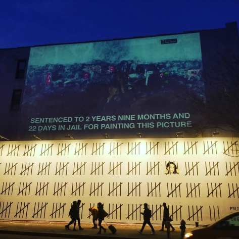 A series of hash bars like days in prison cell are numbered across the mural with one showing Ms. Dogan looking at out of one of the cells, with her left hand gripping a bar that doubles as a pencil. “Free Zehra Dogan” is written in the bottom right corner