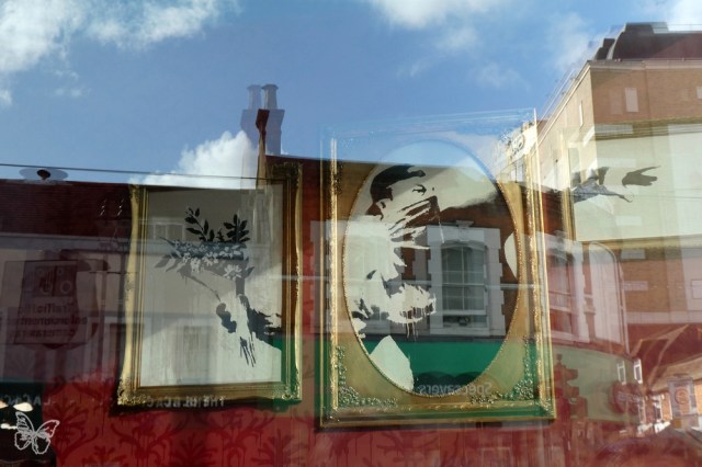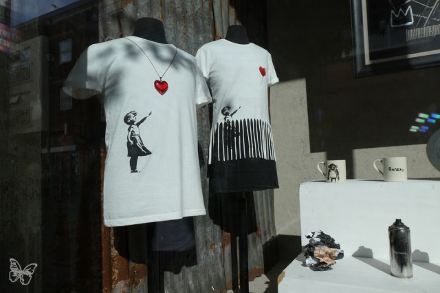 The homeware store – essentially a window display that will never actually open—is selling a range of items, from mugs, spray cans, prints, t-shirts to editions of the stab vest worn by the artist Stormzy at Glastonbury, welcome mats hand-stitched by women in detainment camps in Greece. The objects have all been installed in a series of window displays along with often-reproduced paintings such as Banksy’s Flower Thrower.