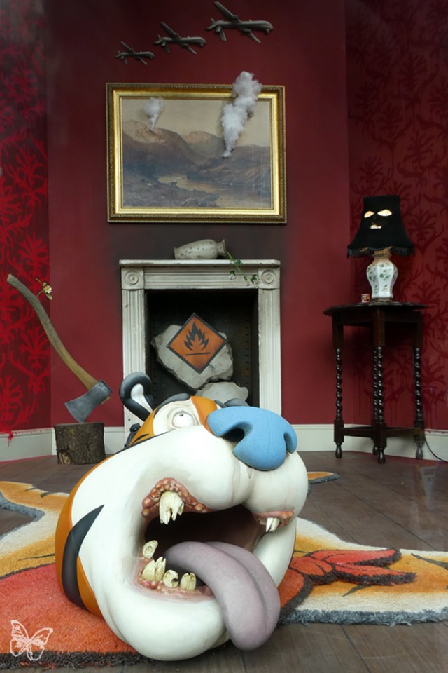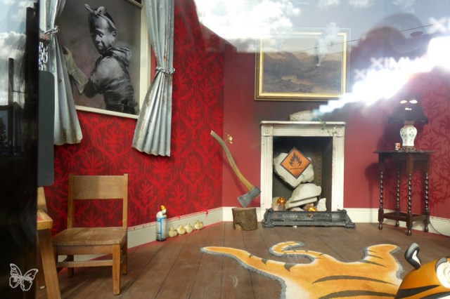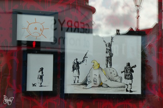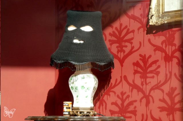 The homeware store – essentially a window display that will never actually open—is selling a range of items, from mugs, spray cans, prints, t-shirts to editions of the stab vest worn by the artist Stormzy at Glastonbury, welcome mats hand-stitched by women in detainment camps in Greece. The objects have all been installed in a series of window displays along with often-reproduced paintings such as Banksy’s Flower Thrower.
