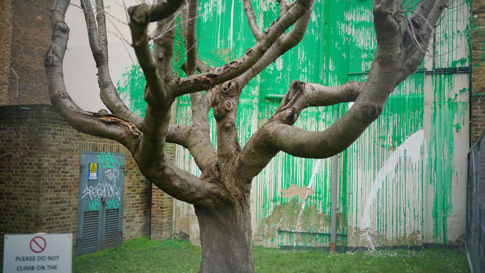 Elusive artist Banksy unveiled a new mural in Finsbury Park, North London on Saint Patrick’s day. Located in Hornsey Road, a social housing area, the council recently pruned a massive mature cherry tree, as part of their regular maintenance, and left it looking miserable.