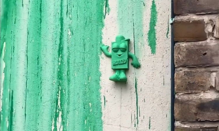 The mural did not last long in its original state. Three days after unveiling the piece, the wall has received some white splash paint, as well as a little addition with a brick signature character by Ronzo. Can you spot it?