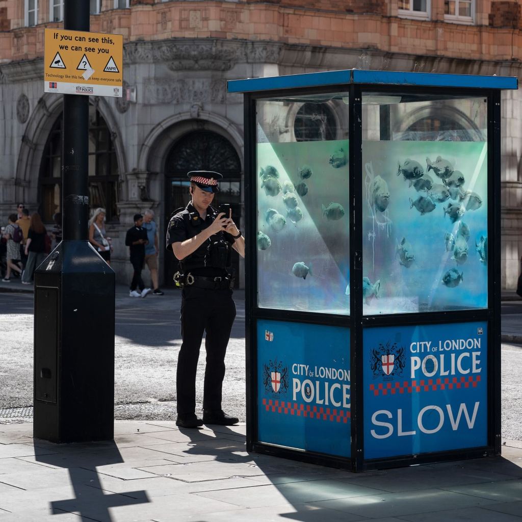 This time it’s in Ludgate, with another more elaborate style. It depicts piranhas swimming in a police entry box.