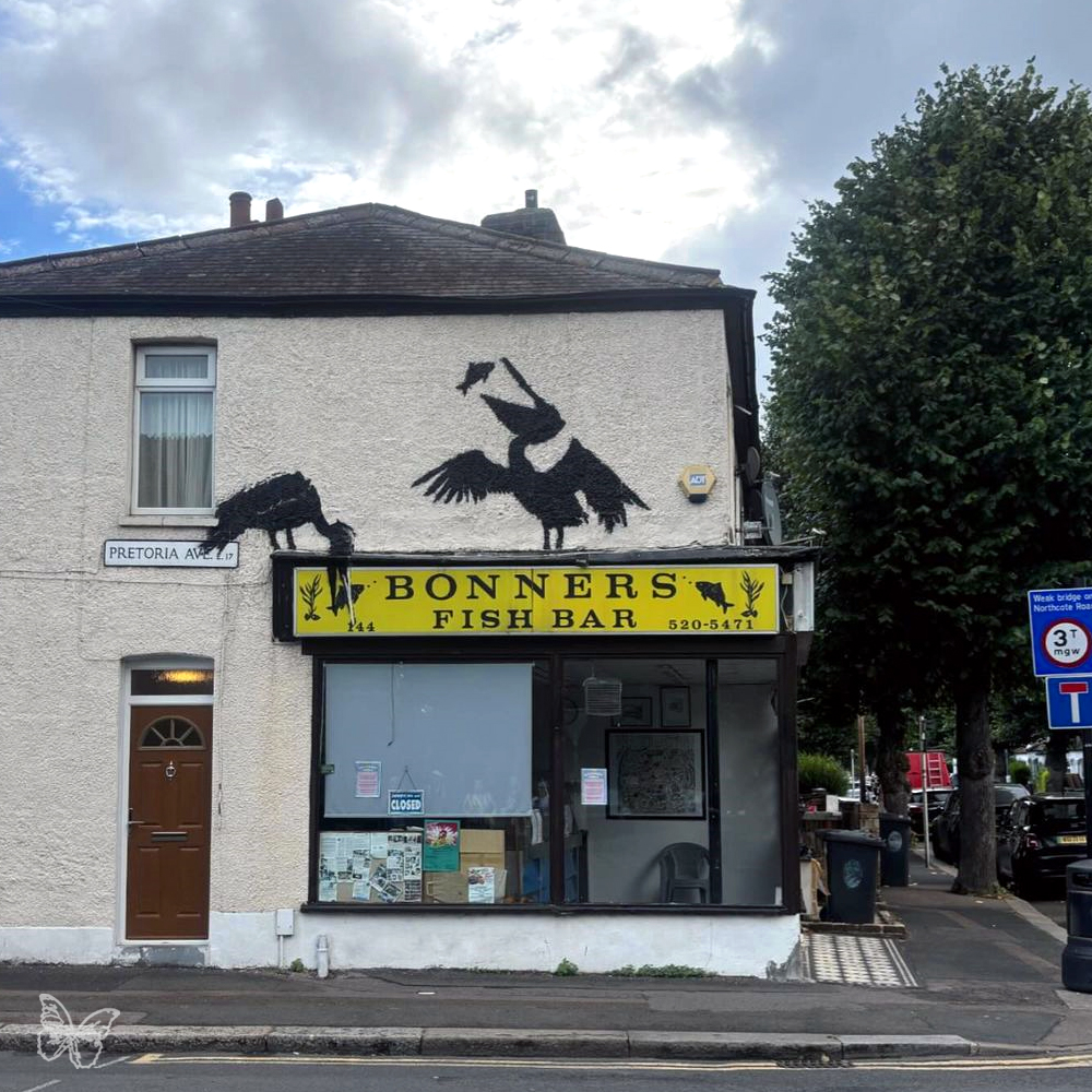 On this fifth day, Banksy unveiled an artwork of pelicans pinching fish from a London chip shop sign. Located on Bonners Fish Bar in Walthamstow, the artwork shows one bird stooping down to scoop up a fish on the takeaway’s sign, while another is tossing one in the air.
