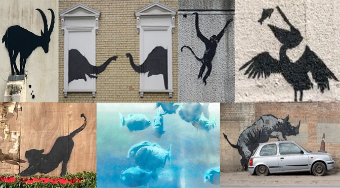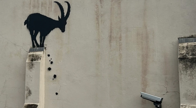 Banksy is still on a roll, with a humorous stencil of a rhino strategically placed, looking as if it’s mounting a car with a traffic cone on its hood. It’s all about placement…