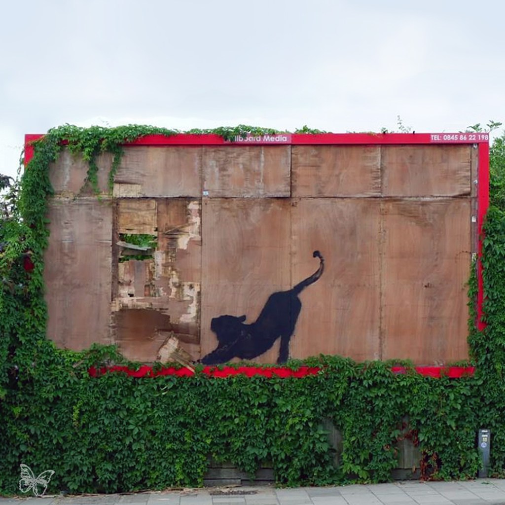 Banksy has confirmed the sixth artwork in his new animal-themed collection across London, a silhouette of a panther on an empty, distressed billboard. The mural is located in Edgware Road, Cricklewood