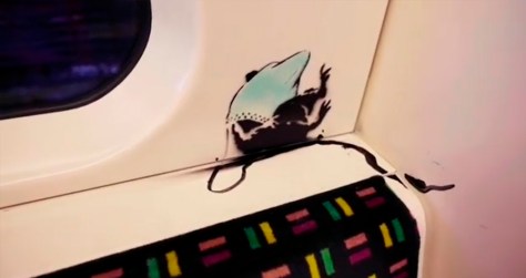 Dressed in protective gear, he sprayed his signature rats in funny situations and playing around with masks. Lastly he sprayed his Banksy tag inside the carriage.