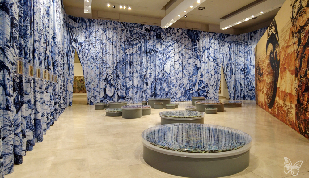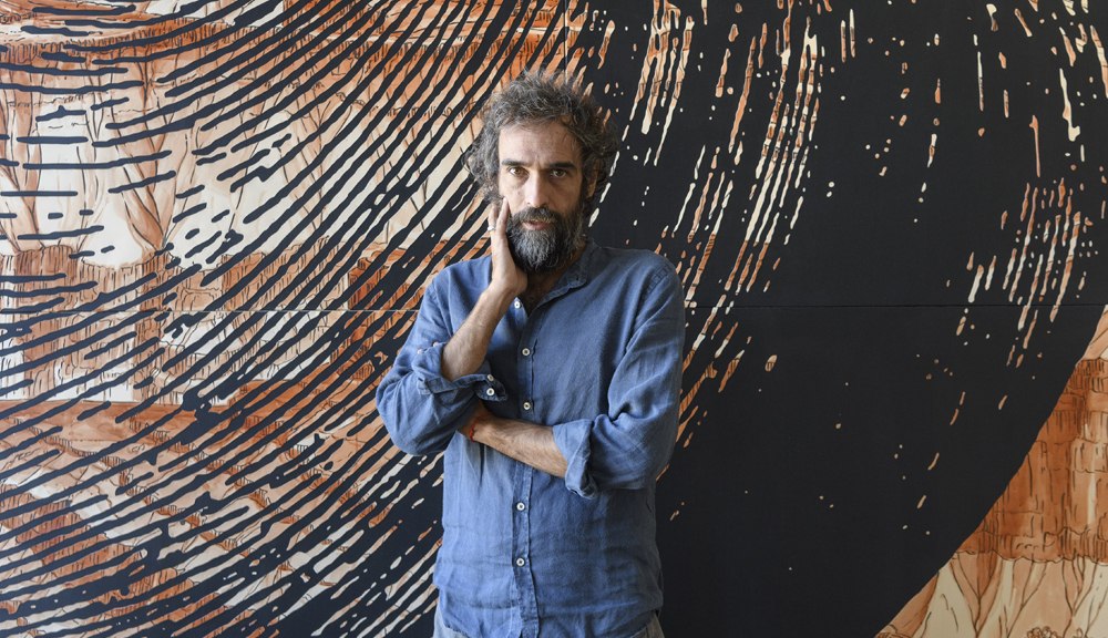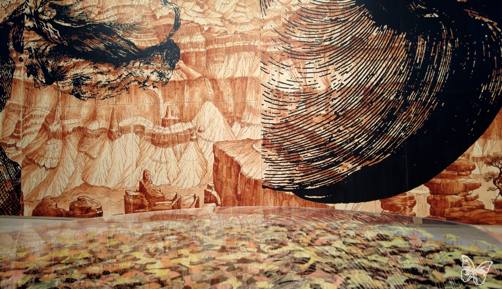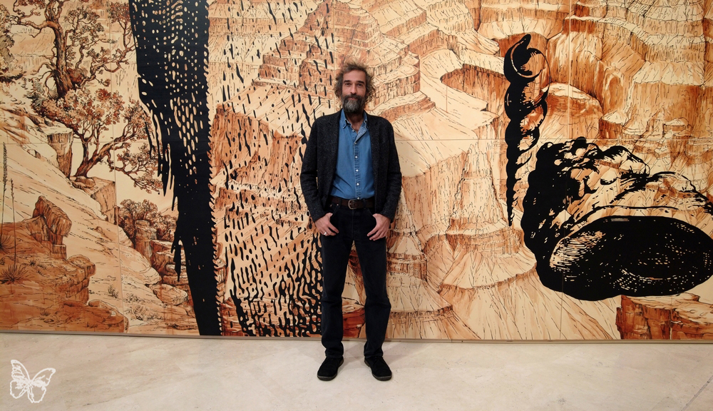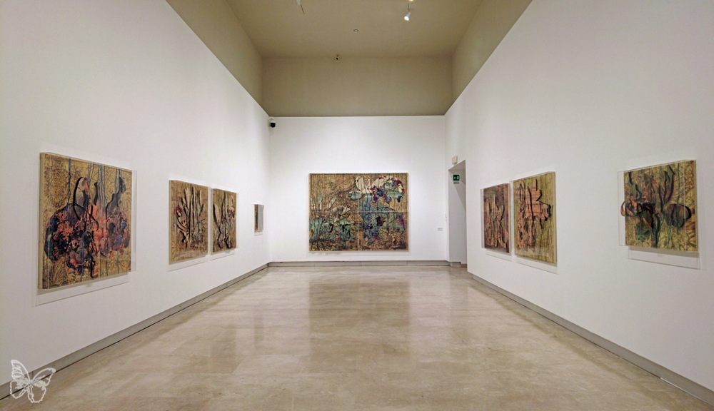 The room is intersected by a large self-supporting structure (4 metres by 21), on which he depicts a section of the Grand Canyon, painted in ink on canvased paper using the camaïeu technique (utilising different tones of the same colour, in this case, burnt sienna). Beyond this grand structure, the public finds themselves walking among traces of the Earth’s past life: 21 circular works of varying sizes, titled De Hortus, floating like water lilies on the white floor, creating a chromatic atmosphere of great visual impact.