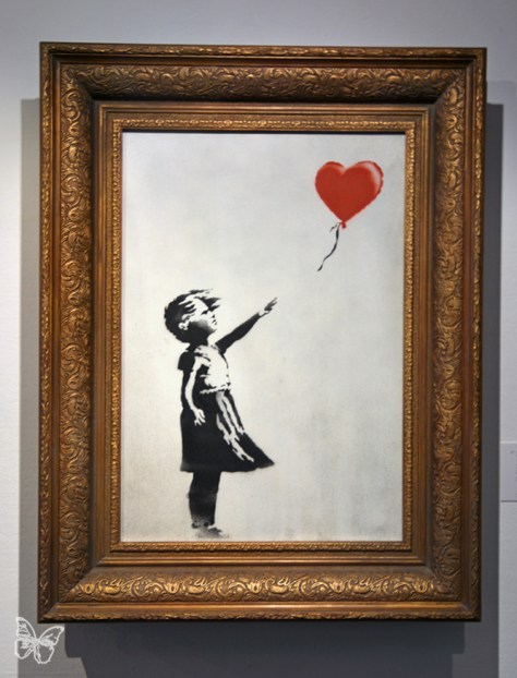 It’s a clear nod to his iconic artwork Girl with Balloon, but the heart balloon is smashed in pieces of roses and poppies. The girl is in the rebellious pose, reminiscent of his Flower Thrower image.