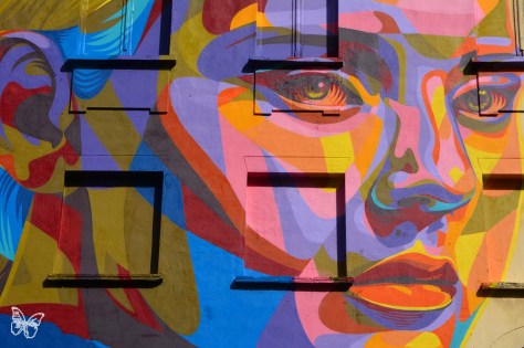 For the Festival Telmo Miel painted a matching series called ‘Welcome’. Playing with the curved architecture, they painted a girl with an umbrella with a little monkey on her shoulder. The first version is under the rain while the mirrored version is under the sun.