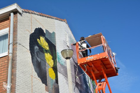 With their mural, Colectivo Licuado paid tribute to Ostend, the city by the Sea. With two two women, they wanted to illustrate a balance between the calm and the storm at Sea. The standing tall blond girl represents storms, with a lot of energy, drawing strings of winds, while the seated brunette is peaceful and having a protecting hand on the boat.